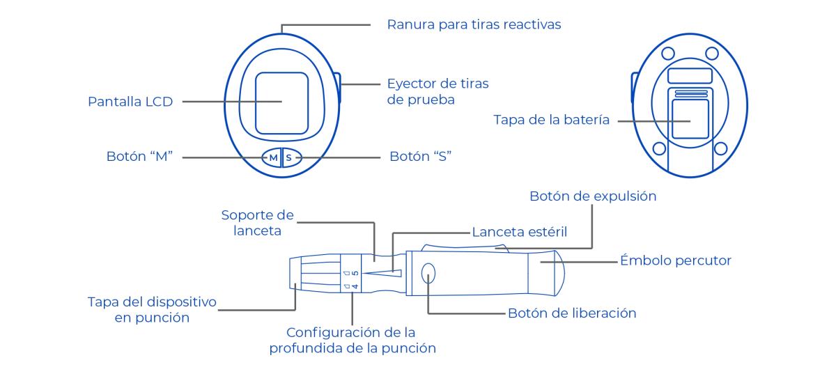 - Preparación del dispositivo: Inserte la batería CR2032 en el compartimiento correspondiente, asegurándose de que la polaridad sea correcta. Verifique que el glucómetro esté limpio y en buen estado.
