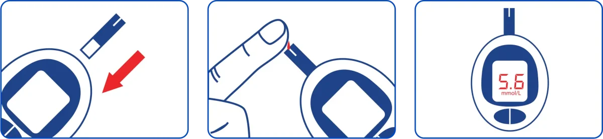 - Aplicación de la muestra: Aplique la gota de sangre en el extremo de la tira reactiva, permitiendo que el dispositivo absorba la muestra automáticamente.